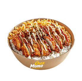 Riz blanc, poulet crousty, sauce blanche maison, sauce sucrée, oignons frits, persil.