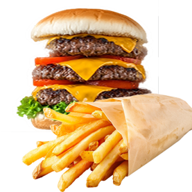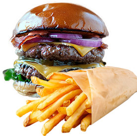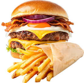 Bun, sauce chef, 2 steaks smachés, salade, tomates, bacon, fromage + Frites.